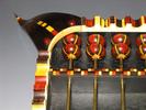 After some study of abaci, Mode first created a proto-type, named Abracadabacus. He then went on to the much larger Rosenblit abacus with some design changes, notably the corner ornamentation, actually inverted bowls cut out and fastened around the corners of the case. The beads in the large abacus measure about three inches in diameter, and it is wall-mounted with the beads moving side to side. Mode completed the two abaci in a little over a month.